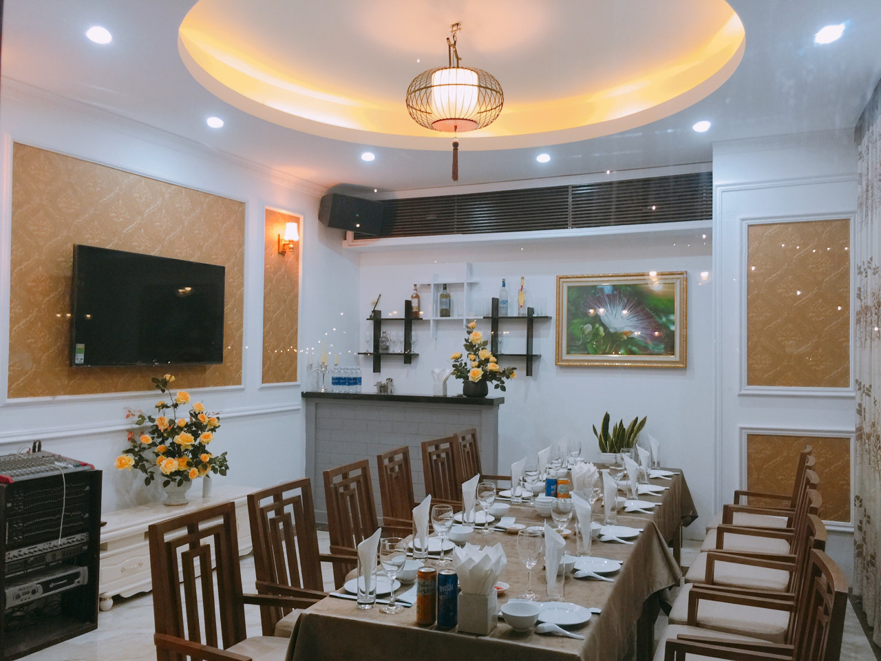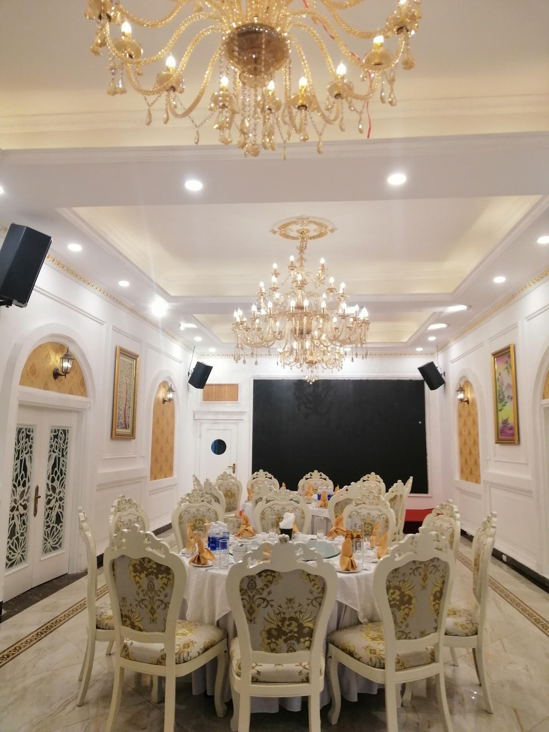 Phòng vip 5 thiết kể cổ điển, sang trọng, lịch sự,phù hợp với bàn tròn ngồi 10 người, có thể kê bàn chữ nhật theo yêu cầu.